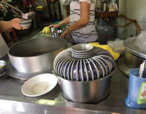 先排队到老板领蒸笼里的肉圆,再捧着刚出炉的肉圆到柜台付账,顺便淋上橘红酱汁,然后再排一次队喝大骨熬的清汤、当然要记得洒上香菜!