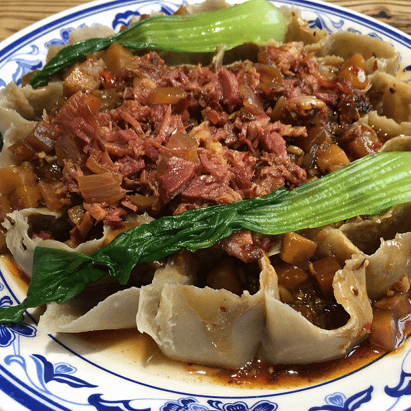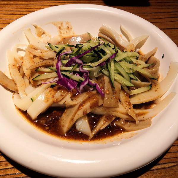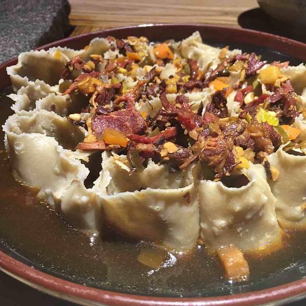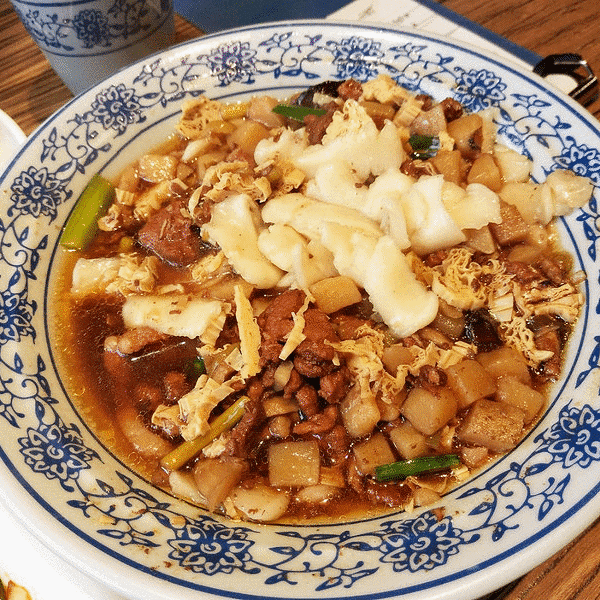 山西的面食那是一绝,传统的刀削面、手擀面、剔尖面就不多说了,平遥的面食花样之多,不得不佩服平遥人民的创意和智慧,剪刀面、猫耳朵、擦格斗、切疙瘩、栲栳栳、搓鱼鱼等等等等,只要是一团面,在平遥妇人的手...山西的面食那是一绝,传统的刀削面、手擀面、剔尖面就不多说了,平遥的面食花样之多,不得不佩服平遥人民的创意和智慧,剪刀面、猫耳朵、擦格斗、切疙瘩、栲栳栳、搓鱼鱼等等等等,只要是一团面,在平遥妇人的手中就会生出了花,各种工具都可以成为厨具,制作出形态各异的面食,丰富了餐桌。在平遥古城,选了一家名气比较大的餐馆——天元奎饭店,一份套餐里两份特产平遥牛肉和蜜汁长山药,另外三份面食,可见面食在当地的重要性。还是要特别介绍一下这家店,室内装饰品都是实实在在的老物件,有的或许价值连城,虽然没有现代仿制的复古风大气美观,但是却最自然最质朴,很喜欢这种感觉,原汁原味。