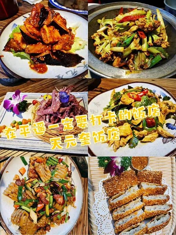 🥘饭店菜品--平遥天元奎 ①牛肉🥩铜火锅:这道菜是平遥的特色菜,必选的一道菜品。 ②平遥🧈黄米凉糕:黄米凉糕配桂花酱,入口软糯,老少皆宜。口感不错,小孩子很喜欢! ③长龙🍆茄子:本店招牌菜,炸的太棒了,表皮酥脆里面软嫩,口味酸甜下饭神器,重点是吃起来不油腻,喜欢~ ④牛肉🍜罐罐面:山西的特色面食西之一,牛肉混着葱味,味道也很不错,吃起来口感有点刀削面的感觉。 这家店绝对是来平遥古城非常值得一尝的店铺,老字号的招牌!店内环境干净整洁,服务热情好客,让你有种回家的感觉💞 📍 详细地址:平遥古城中心南大街73号💎美食推荐:平遥天元奎--南大街73号 🌻这家饭店我来了第n次,真的爱了 💥💥作为平遥的老牌网红餐厅,来平遥古城一定要来吃! 🔥穿过大大的门面,像是穿过一个弄堂小院,景观很别致,能容纳的下多人用餐,环境很赞,复古又穿越的感觉🌻🌻🌻 感觉就像是在多年前的那种农家小院,舒服又惬意。🌻🌻🌻 💥💥点了长龙茄子和牛肉铜锅,还有蜜汁长山药,很有平遥味道,上菜速度很快,吃完菜之后有些明白天元奎为什么这么火了!不仅仅是环境好、服务好,更重要的是菜的味道相当棒,分量又足。 💥💥被牛肉铜锅圈粉了,牛肉、白菜、豆腐、粉条,在铜锅里碰撞出了舌尖上的无限满足,超级好吃,稍微有一点辣~不过相当过瘾! 💥💥长龙茄子 不得不说这个茄子 排名第一的,口味偏甜辣,仿佛像松鼠桂鱼的样子,而且不油腻很合口,适合下饭吃!!! 💥💥牛肉铜火锅 份量足,牛肉是选的筋头巴脑,嫩儿不柴,里面是荤素搭配的,有宽粉 白菜 油炸豆腐 土豆 干豆角,味道绝美!!!平遥随拍