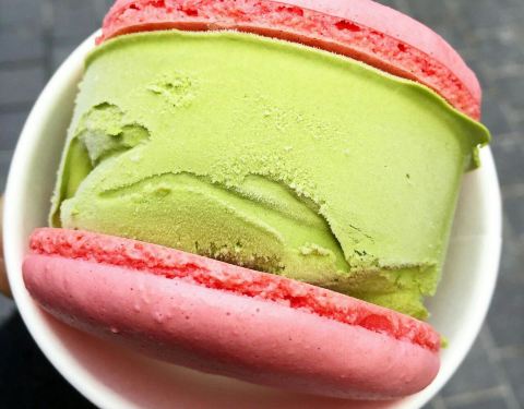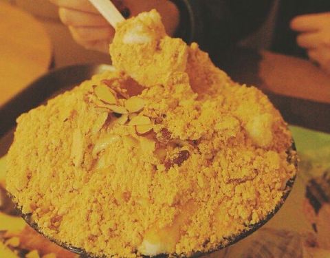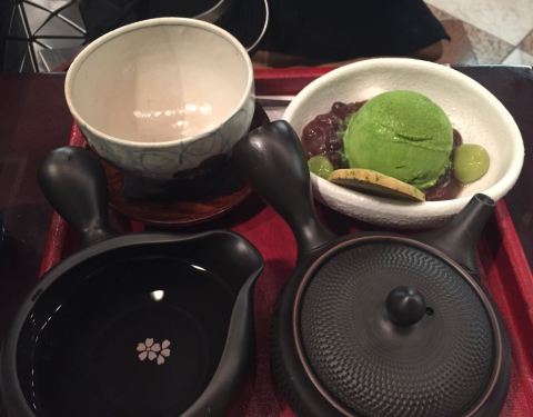 - ...有好吃的抹茶冰淇淋,一碗冰淇淋里面就一个球啊,上面还有一点红豆红豆熬得非常甜哦,而且非常的酥啦