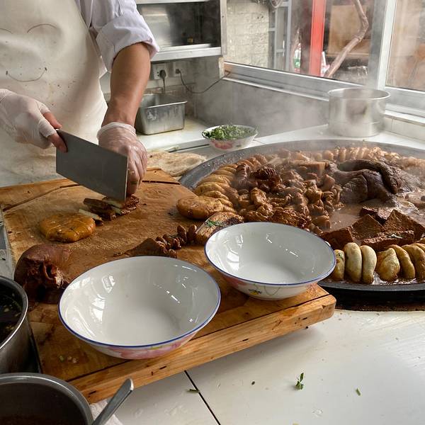 进门后,好香哦。 卤煮感觉就好像是很多内脏煮在一起。 我觉得都挺好吃的,没什么雷点。 我和先生一人一碗~ 吃得美滋滋~原打算再转战回去吃爆肚冯的。 坐下点菜的时候才发现,爆肚冯好像是火锅类的主食…… 这个点吃火锅好像有点早了,只能下一回了。