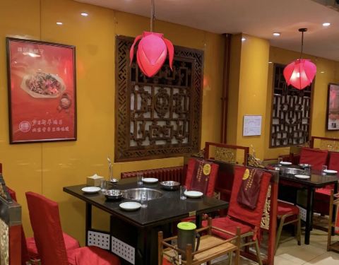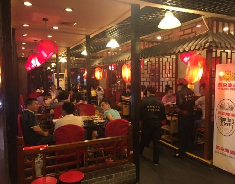 - 店面红色基调,桌桌食客爆满,气氛热烈。到店时已经是晚八时,夜色笼罩了,但门前仍有排队等位的食客