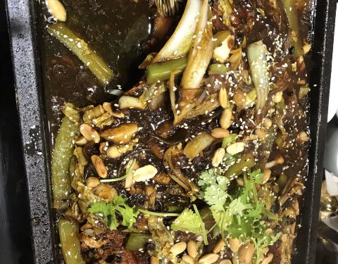 豆豉味的烤鱼,料很足,很有味,只是上的太慢了,非常慢,比别的菜慢了足足四十分钟,其他菜品基本上二十分钟内就上齐了,所以都吃饱了,等烤鱼上来基本就没有吃了,只好打包!打包餐盒还收费!这店家也真是太会做生意了吧?!上菜速度慢明明是你们自己的责任,不给退菜,还要让我们再掏钱打包!
