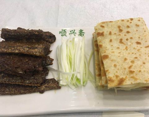 是丽都饭店对面小区里的一家地道的北京馆子,正值春节期间,客人不多,听口音都是老北京人。餐厅面积不大,倒是二楼还有空间。看看菜单都是北京家常风味,点了两个推荐菜:长豆角茄子、烙饼卷带鱼。长豆角茄子中规中矩,菜炒的油亮发光,咸淡适中,香气四溢,吃完了盘子里并没有很多油,放料的分寸正好。烙饼卷带鱼份量很足,带鱼入口酥香,以咸口为主,是老北京的特色,只是有两块带鱼又窄又碎,不是好料。真正好吃的是那一小摞烙饼,外表金黄,饼香四溢,就是不卷带鱼单吃也很可口。别看只两个菜,够三个人吃了。