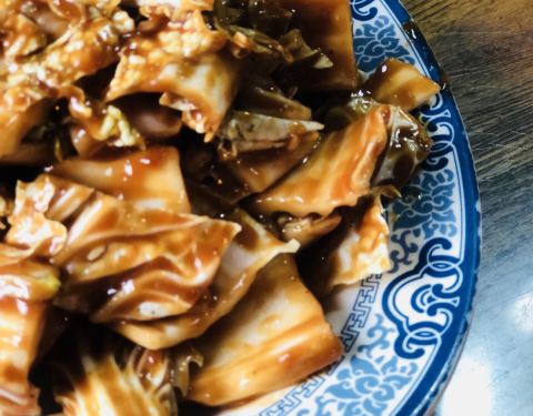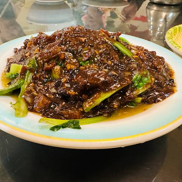 「大懒龙」 就是冲这个来的,到底吃上了。肉馅是真大,颜色也是真诱惑,咸起来也是一点不含糊,不过我倒觉得对着呢,发面的带馅儿面食,味道不重就没意思了,咬一口馅儿没到,咬二口馅儿过了,那我还不如吃馒头呢。 「肘子」 真香啊,肥而不腻瘦而不柴,喷香入味,烂糊挡嘴,成品的样子就是典型老北京馆子炖出来,味道也是古法,一点儿没差,想回忆老味儿就选他家不会错的。 「传统爆三样」 这菜从摆盘到口味,都是“老板把烟屁一撵,跟厨房说,今儿我想露两手,你们都给我起开”的意思,大火爆香,咸鲜下饭,砸么两口二锅头也极为应景。 「味道黄花鱼」 蒜瓣肉好吃也好做,但要是能让老饕竖起大拇指也不是件容易的事,他家这汁儿浇的太“市井”,鱼炸的火候特“胡同”,还以为这种手艺失传了呢,到底还是在城里头把这门艺术扣住了,欣慰!