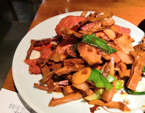 客家黑鸡汤:乌鸡一部分吃,一部分放到汤里煮,鸡肉很嫩,蘸小料吃,汤鲜味美。 大巴山老腊肉炒笋:腊肉肥而不腻,非常香,适合下饭。 转炉火烧夹双拼酱:火烧是芝麻的,双拼酱是茄子、辣椒两种,辣椒不是很辣,...