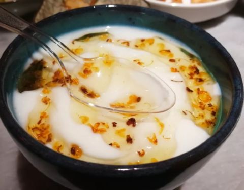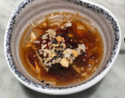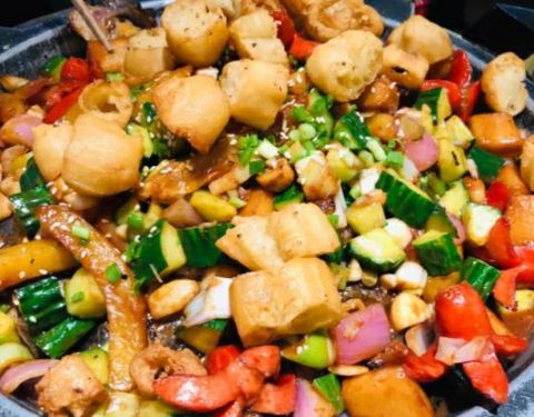 豆豉的鱼,配了很多配菜,鱼烤的外皮很脆,肉很嫩。配菜里最喜欢午餐肉,宽粉,已经完全吸收了鱼的鲜味,还有肥猫炒饭也很好吃