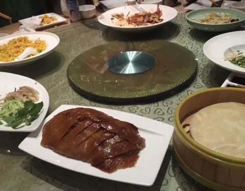 大十一的假期,一大家子人聚会,定包间晚了一点,就只能等翻台的时段了,因此12:30点才能开饭。没办法,这就是节日。。 【位置】就在石佛营路口,位置还比较好找,门口等位的人确实不少。 [环境]【环境】装修有些特色,明显的中西结合的风格,感觉还不错,虽然人多,也还干净整洁的。 [服务]服务热情,上菜的速度也还及时,尽管是屋屋爆满。 点了一大桌菜,一开始就推杯换盏了,所以也就没可能再逐一拍照了,哈哈只有几个菜还有一点印象… 【|金牌烤鸭^】口感不错,火候刚好,很香。 |蓝莓山药^滑腻爽口,很受老人孩子欢迎。 |风味荞面包^每人一个,口感也还不错。 一直吃到下午3点,大家才尽欢而散。