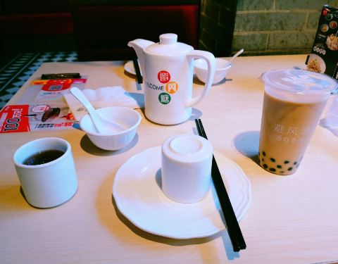 午后的阳光暖暖的,照在人身上升起一股倦意,不如去吃避风塘吃个工作日下午茶套餐抖擞下精神。 [环境]位于长乐路上避风塘锦江店装修后风格变了,卡式沙发座和大胆的中国红是主基调,黑白格子地砖配黑白凳子又有老上海风情,墙上的大幅欧美老牌明星照多了些时尚和休闲元素,中间摆放的绿植既美化了环境又作为隔断增加了座位间的私密性。 最爱坐在景观位看大落地窗外的风景,一个人的下午茶轻松又惬意。 |避风塘珍珠奶茶^来避风塘奶茶肯定要喝的,里面加上Q弹的珍珠那就更好吃啦。 |牛油菠萝^作为港式茶餐厅,牛油菠萝包是必点的,外皮形似菠萝其实是很香的酥皮,里面夹上一块牛油涂抹均匀,吃起来面包松软和动物奶油的香滑真是完美结合。 |酥香焗鸡翅^波浪形薯条和焗鸡翅真是一对最佳CP组合。 这个下午茶套餐现在有团购优惠,原价58元现在只要30元,相当于半价,一个人能吃饱喝足,性价比很高。 [服务]进门店员就热情的招呼,领我到景观位送来菜单并倒上茶水。无奈我点单后新沏的茶刚喝了一口,接到母亲大人的电话,说刚买好了大闸蟹叫我赶快回家。好吧,食物只能通通打包,赶紧告诉服务员及时调整,这是让我化身外卖姐姐。等了一会儿果然食物都已经装盒,连黄油也有冰袋保护着,这波操作妥妥哒。 看来妈妈的突然袭击正打在我的七寸上,独乐乐的想法不该有,众乐乐才皆大欢喜呦。你们放心,这个套餐已经带回家让小侄女享用了,她吃的非常满意。我当然留着肚子迎接无肠公子啦 。