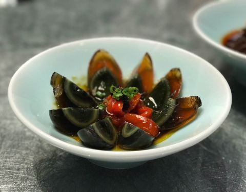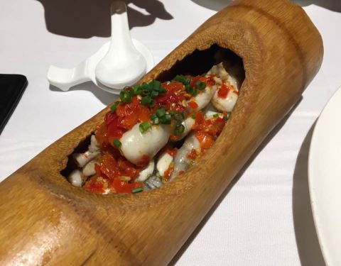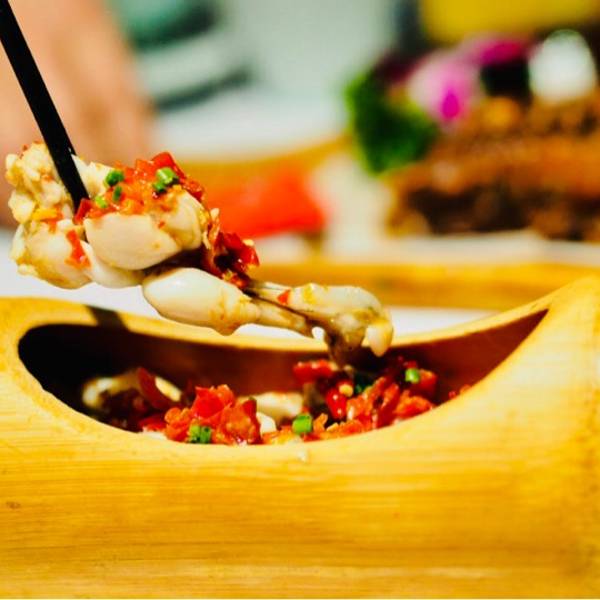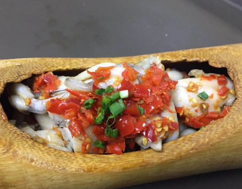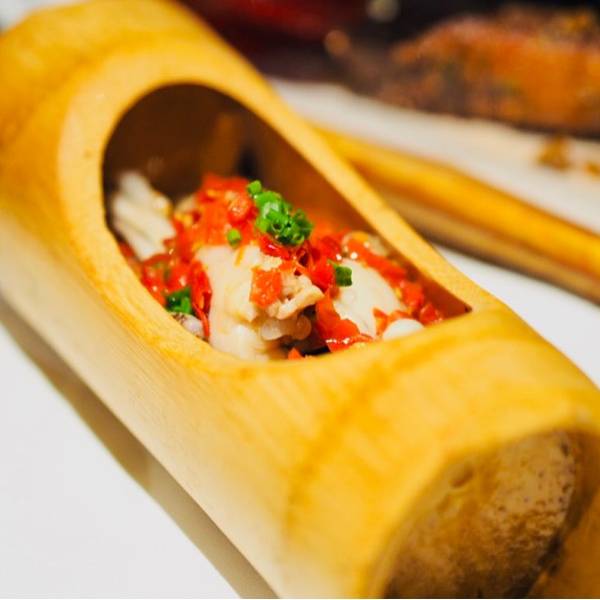 一个竹筒里容纳了四只牛蛙,那就是有八条牛蛙腿,量还真是不少!蛙腿各个像练过gym,搭配特制的剁椒酱,鲜嫩度又⬆️几个level,底下还铺了几个软糯的芋奶,也蛮入味的!