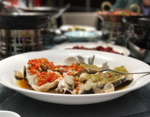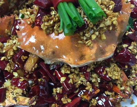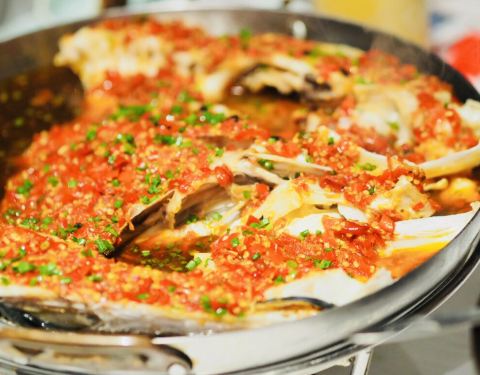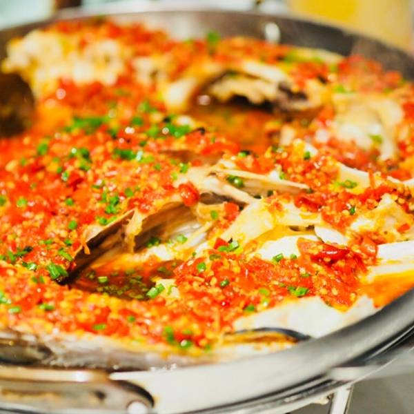上面红红的️酱盖满了一层,鱼头蒸的时间很精准,入味且鲜嫩都体现出来了!后者非常爽口解辣