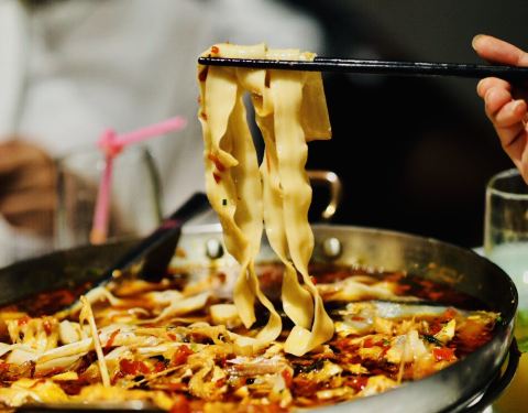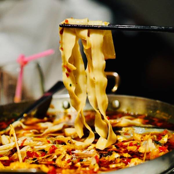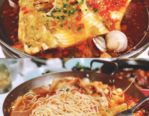 大鱼头🐟真的是量大,2000g左右的分量可以多叫几个朋友一起分享!上面红红的🌶️酱盖满了一层,鱼头蒸的时间很精准,入味且鲜嫩都体现出来了!就算不太能吃辣的我也忍不住多吃了几块,最后还加了份手擀宽面,吸附了酱汁真的是好吃得飞起!