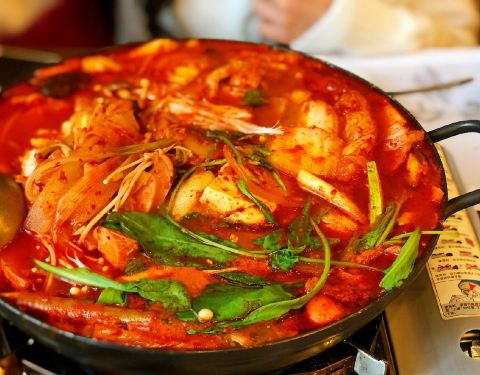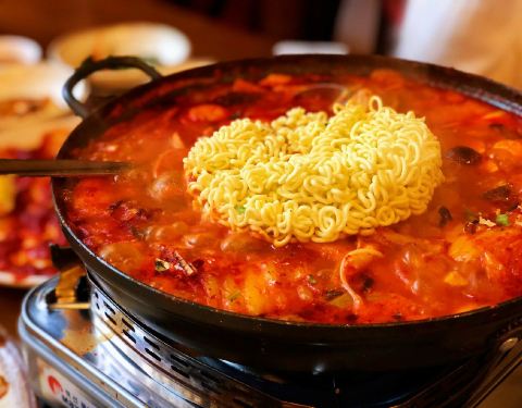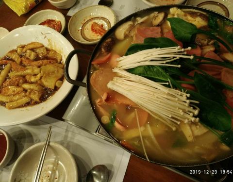 「辣炒年糕」全场最佳!年糕软糯、鱼饼鱼糕Q弹,粉丝也非常筋道,还有一颗白煮蛋哈哈哈哈,裹着满满的甜辣酱汁,超好吃。 「部队火锅」常规款部队锅,很大一锅各种香肠,火腿,午餐肉,年糕菌菇,蔬菜红通通热辣...