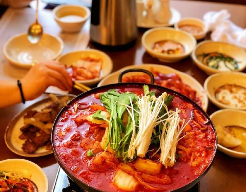也是吃韩国料理的地方,开在居民区里面,所以这里有很多的韩国人来吃,味道是不错,很符合他们韩国人的口味,蛮正宗的,关键上菜前会送很多很多的开胃小菜,十几种啊,一会儿就把一半的桌子沾满了。喜欢吃这里的豆腐辣汤,很下饭,如果只是想填饱肚子的话点这些就足够了。