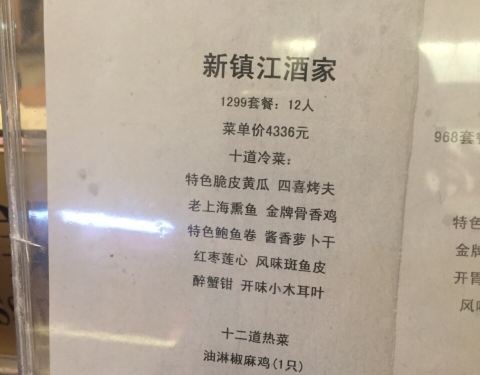 2018年的春节即将来临,年夜饭对于中国人来讲是尤其重视!随着市场的发展,年夜饭的价格是年年攀高。对于吾等屌丝来说,已经快受不了了,于是决定买些半成品回去,自己加工加工,家里人一起坐下来吃吃聊聊天,虽...2018年的春节即将来临,年夜饭对于中国人来讲是尤其重视!随着市场的发展,年夜饭的价格是年年攀高。对于吾等屌丝来说,已经快受不了了,于是决定买些半成品回去,自己加工加工,家里人一起坐下来吃吃聊聊天,虽然味道无法和店里大厨做出来的相比较,但是关键是一家人可以坐下来聊聊天,吃一个热闹,吃一个气氛! 新镇江的年夜饭推荐力度不大,当日去,楼下服务员都没有,只有一位买熟食的阿姨在照顾…哎!大牌老字号的品牌企业,你们怎么会这样待客?