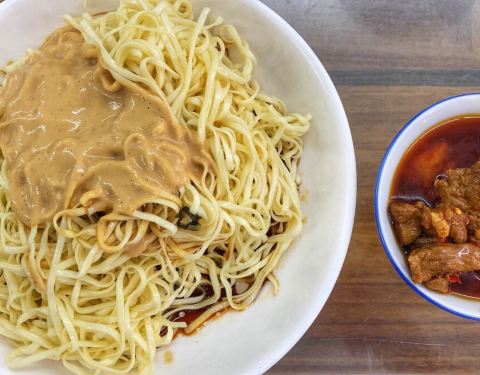 听闻开了几十年 在居民区里的面馆 本来想去附近的德兴馆 本着就近原则 选了它 规模还挺大的 周末晚市客流较少 老式的吊扇 老式的桌椅 服务员坐着休息 有些在吃晚饭 品种还是很多的 点心盖浇饭面食都有 夏季有冷面上市 可以微信买单 「素浇汤面」¥10 清汤挂面的浮着油面筋、香菇和葱花 讲真 光吃素浇还蛮入味的 甜口的表示喜欢 面条白皙偏柔软 对得起这份价格吧 「辣肉拌面」¥22 浇头和冷面分开的 冷面的调料需要自己拌匀 麻酱和花生酱略浓厚,醋放多了~辣肉空口吃也不赖 加入面条多一味辣度 两份面食都很普通 也没吃完 一个过于寡淡 一个过于浓厚