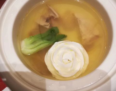 印象深刻的是本帮中浓油赤酱的小仔排,撒了把白芝麻,吃起来很紧实,配了自制的甜辣味的辣白菜,非常爽口。千张整齐排列,还搭配了一些蔬菜,葱油白切鸡是我的最爱,简单却不乏好味,鸡肉处理的很嫩,葱油的香味渗入,滑嫩爽口,是一道很有口碑的菜;其他也是荤素搭配,菜式丰富。 这里的煲汤也不错,按例上,选了一款铁皮枫斗山药炖野鸭,汤头很清冽,咸鲜为主,原来枫斗就是铁皮石斛鲜条,家里也经常选用来煲汤,所以一看就认出来,食材比较珍贵,加上山药的糯和野鸭的酥,一道适合秋季饮用的汤品确实ok。
