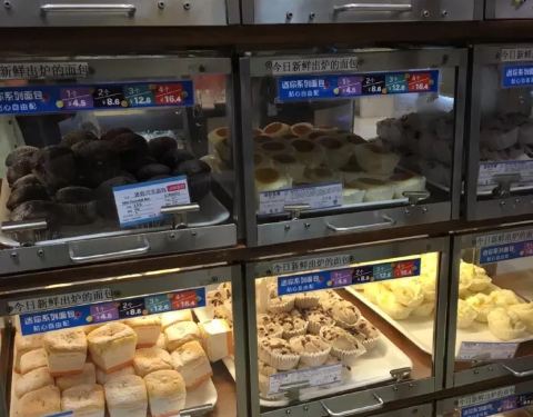 店内的员工真不少。 收银员专职收银,旁边还有一个员工专门装袋,倒是较卫生。 店不算大,烤箱占了一半的位置。 不断有新鲜出炉的面包。 面包柜里会标上哪些是新出来的。 门口的吐司台上方也有各种吐司新鲜出炉...