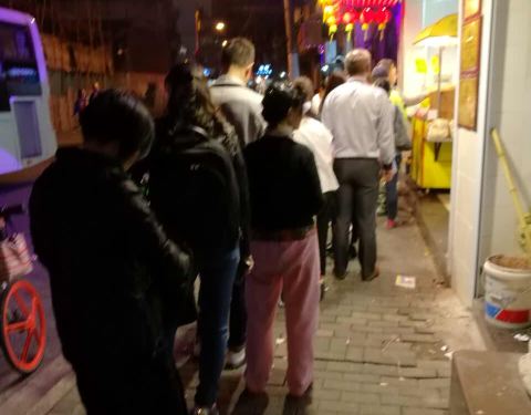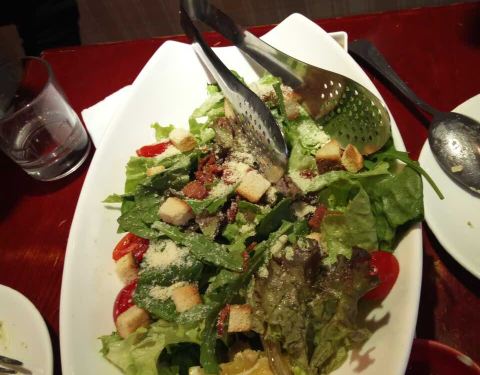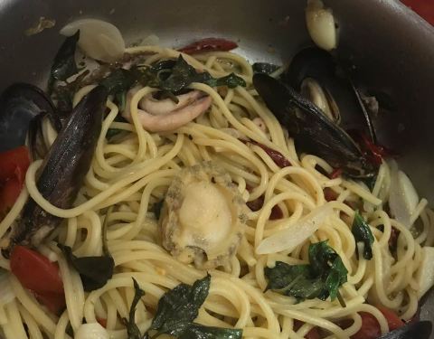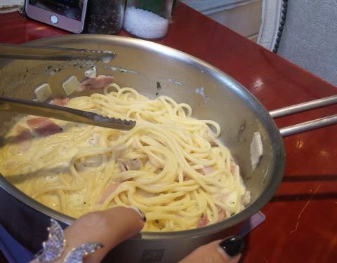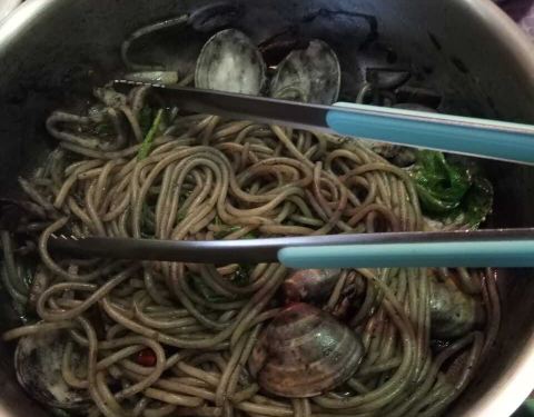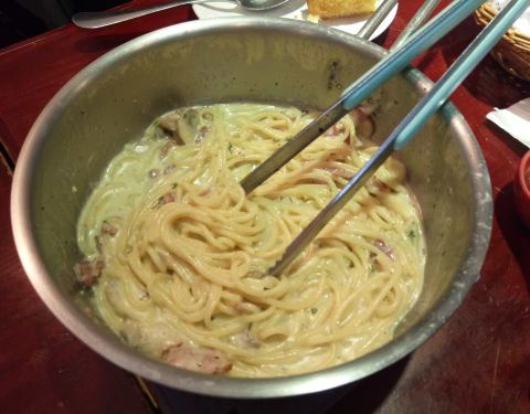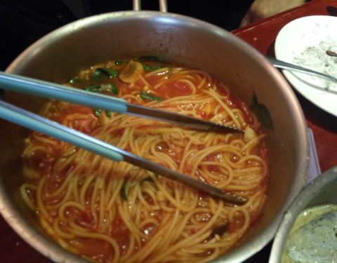 中午人很多,要排队。有他们特色的意大利面,那个锅端上来了,很有特色。