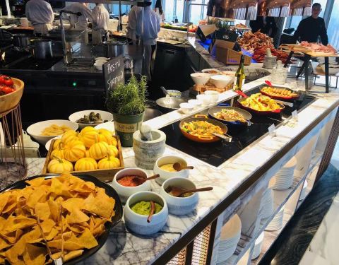 上海金茂君悦五星级大酒店,闻名大上海,20多年前收集交通、地铁及旅游纪念卡时,就收集到第2张橙色金茂君悦大酒店非常有特色的电梯楼层照片。 2019年10月25日,第一次前往该酒店享用自助餐,总体体验感较好。 [地理位置]: 上海浦东新区世纪大道88号(金茂大厦内)。 [交通便利]: 地铁2号线陆家嘴地铁站6号口出,步行767米到达。 [餐饮环境]: 不是一个整块的自助餐区域,围绕着金茂大厦四周边缘,穿过一条走廊的四周区域即为自助餐区域。 [服务态度]: 比较好 [餐厅特色]: 著名的上海“厨房三件套”之一的特色建筑。可以一边享用午餐或晚餐,一边欣赏上海黄浦江两岸建筑。 [餐厅楼层]: 位于金茂君悦大酒店56F,电梯到55楼后,再转另一部电梯可到56F自助餐楼层。 [美食推荐]: 1、长毛蟹:尤其是蟹钳,是难得的美味。 2、现磨拿铁咖啡,浓郁味正。 3、甜品:味道可圈可点。 4、菠萝:味甜清香。