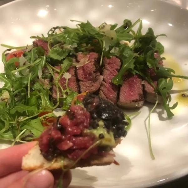 这家店超有人气的,老远就看到有排队的顾客了,一定有她的特色在!一楼晚上是个小酒吧,二楼就是她家的西餐厅,座椅一对一对排列有序,桌子上都摆放着美丽的小花,背景是轻柔的爵士乐,浪漫气氛油然而生,超级适合小情侣约会啊。 服务生彬彬有礼,询问人数后安排落座并帮杯中倒水,服务很细致。 牛肉塔塔配牛油果黑橄榄酱 摆盘就很好看,上层是生牛肉碎,中间是牛油果,底层是黑橄榄,颜色分明,层层相叠,摇上一口,不知道厨师是如何做到的,口感极嫩,而且营养价值很高,配餐面包烤的很到位,脆脆的很喜欢。 烤鸡 肥嫩多汁,配菜薯角毛豆秀珍菇,使得整道菜荤素搭配得当,份量也很大。 远超期待的一顿大餐,而且性价比极高,应该就是这家人气爆表的原因吧,超赞。