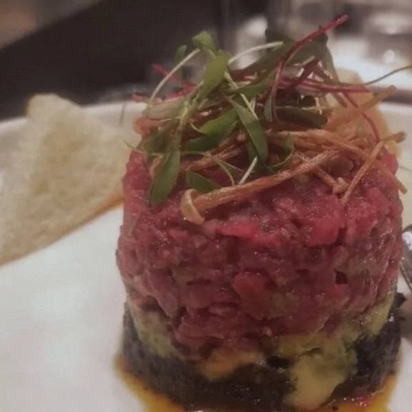 - 牛肉塔塔配牛油果黑橄榄酱 摆盘就很好看,上层是生牛肉碎,中间是牛油果,底层是黑橄榄,颜色分明...