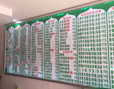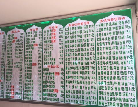 蛮正宗的一家清真馆,平时猪肉吃的比较多了,难得换换口味,牛肉拉面 , 新疆拌面 , 羊肉串 , 大盘鸡 , 孜然羊肉 , 羊肉泡馍 , 孜然羊肉炒饭 , 酸辣汤 , 凉面 , 炒面片 , 牛肉饺子 , 牛肉炒面片 , 酸辣土豆丝 , 两...