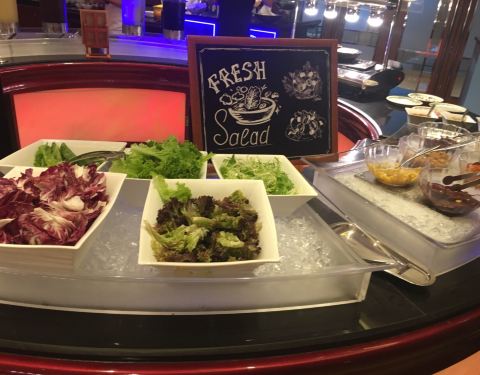晚市自助餐 17:30-21:00间供应 准时开放 进门就看到一排排的酒柜 环境稍显黯淡 酒店应该想营造一种“低调”氛围吧 引入眼帘的就是西点区 品种不多 但每个看上去都好想吃 服务员会引领我们入座 这个自助餐不包含酒水饮料的 还以为周末人会很多 上座率很欠啊 靠窗位置基本都给家庭包了 刺身区 蟹脚不错吃 肉质挺鲜美的 三文鱼也挺肥厚 (位置有些分离,一个在进口处 一个在炒菜区旁) 色拉区 自己动手diy 想吃什么自己加 冷菜区 中西合璧 本帮的熏鱼 日本的烟熏三文鱼 都给好评 烧烤区 一整排放着生的食材 需要的自己挑选给师傅烹饪 海鲜较多 生蚝刺身某人可是吃了很多呢 滑溜新鲜的口感 给个好评 炒菜区 品种不多 没什么大花头 倒是有两款中式点心 小笼包&虾仁烧麦 小笼没汤汁了 肉馅的味道却不错 鲜甜的那种 烧麦嗲 起码有三颗虾仁呢 嚼劲十足 涮煮区 就是面食 米线神马的 要料自己加 没尝试 甜品&冰激凌&水果区 甜品绝对要找那种大蛋糕的好 现做的新鲜 味道也好吃 绿茶慕斯&提拉米苏给好评 小份的那种卖相好 吃起来就感觉放久了不新鲜 很多蛋糕都干干的 不湿润;冰激凌有五种口味 香草 巧克力 草莓 香芋 芒果 自己挖着吃 没有牌子 吃口很一般;水果四种 火龙果 西瓜 哈密瓜 小金橘 咳咳 都不甜啊啊啊啊