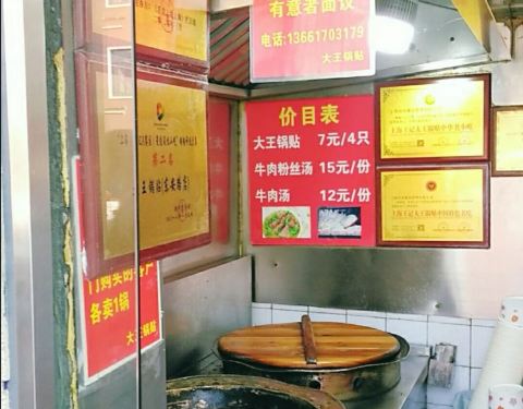 大王锅贴居然也有好几家分店了,不过似乎各店水平差距较大。以前上南路开过一家,个头大内容却少,所以尽管促销没停过,却开了几个月就撤了。东安路上的这家已开了很久,我倒是第一次尝试,哦,大王的精髓还在,...大王锅贴居然也有好几家分店了,不过似乎各店水平差距较大。以前上南路开过一家,个头大内容却少,所以尽管促销没停过,却开了几个月就撤了。东安路上的这家已开了很久,我倒是第一次尝试,哦,大王的精髓还在,个大底脆,一咬一包汤,肉馅儿也足,好吃!店面简陋了点,价目牌上还写着有其它品种,实际早上只做锅贴,专注一样也是好的。
