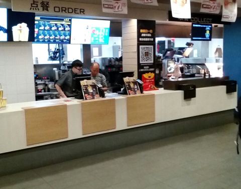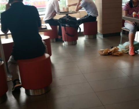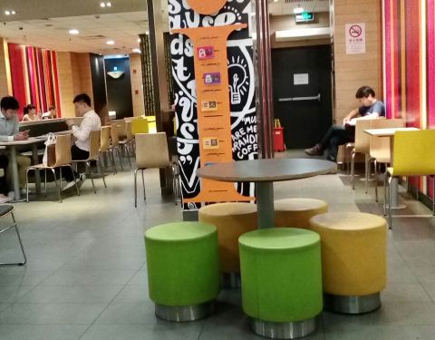 ...,靠近崂山东路口,规模较大,有两个楼面,这里为顾客提供各式汉堡套餐,还有炸鸡、冷热甜品、饮品等
