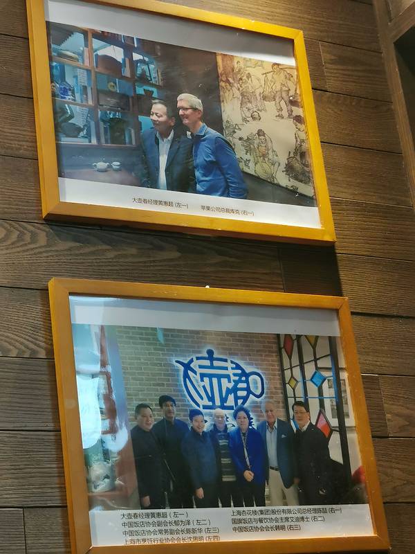 到上海先吃顿正宗的生煎包。本想去小杨生煎,但是当地人不推荐,说味道不够新鲜,网上的评分也一般。来到这家“大壶春”,生煎包个头真的很大,一个生煎要分四五口才能吃下,馅儿挺大,只是汤汁偏甜。下午生煎包有些凉,点了三拼生煎,虽然菜单上没有这个选项,但是可以三种生煎:鲜肉,虾肉,蟹黄,每种两个。总共22元,再加上一碗11元的千包粉丝汤,就是豆皮里包肉,整体好评,量都很大。苹果CEO库克都光顾过