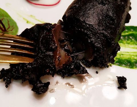该说不说,厨师的选材真的是下本的。两头乌是用来腌制金华火腿的小猪猪,除了贵没毛病。特点就是皮如纸薄,肉质又很细腻,烤乳猪就不合适,但做红烧肉就完美,下回自己在家也试试。
