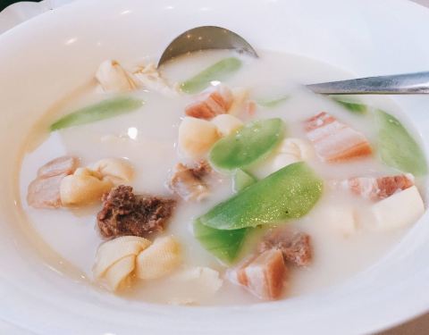 要夸夸这里面的汤圆,小时候外婆自己做汤圆,黑洋沙馅里面都会裹一丢丢猪油,这样煮熟以后猪油化开和芝麻融在一起,咬下去一包汤汁,芝麻香混合猪油香简直了。今天这颗汤圆让我吃出了小时候的记忆。值得表扬。
