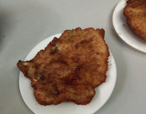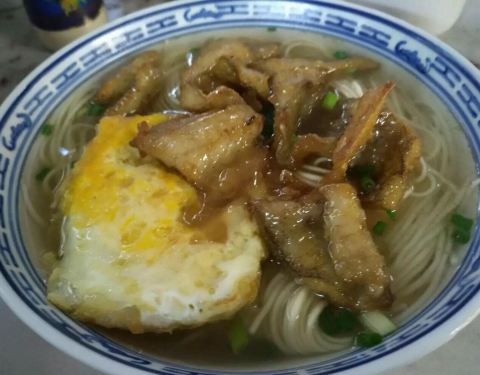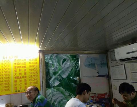 店是沧浪亭的何师傅主理的。 原以为是位男师傅,哪想到看见的是位瘦小的女师傅。 她一个人够忙,不但要下面加浇头,还要收钱。这个卫生嘛,就睁一只眼闭一只眼了。 店面同这附近几条路上的小面馆一样,很小。位...店是沧浪亭的何师傅主理的。 原以为是位男师傅,哪想到看见的是位瘦小的女师傅。 她一个人够忙,不但要下面加浇头,还要收钱。这个卫生嘛,就睁一只眼闭一只眼了。 店面同这附近几条路上的小面馆一样,很小。位于老房子里。 外面摆着一张桌子。 下几级台阶到店里面,也就四张桌子,还挤挤的。 开着窗户通风,里面有风扇,可这不大热的天也很热。 好在收拾得还算干净。 门左手门是不大的操作间,一边叠着一摞猪排。 一个阿姨负责炸猪排,见我拍照,很配合地特地停顿了一下。 另一个老头负责端面收拾桌子。还有一个阿姨洗碗。 共四个人工作,态度都很温和友好,不像有些小店很拽。 先找何师傅点了面,交了钱。 特地去得早一点,有位子坐。不过,面上得很快,大家也吃得快,所以翻台挺快的。 到十一点半后人就多了。 黄鱼鱼片面: 碗不讲究,一般的蓝瓷碗,不算大。 面条是细的碱面,韧劲不错,只是久了,有一些发粘,不够筋道。 汤是清汤。 黄鱼切成片用油现炸好,大概八小片。肉质很嫩滑,稍有点腥味。 鱼泡在面里后,味道慢慢渗入面中,面条的味道由淡变得鲜了一些。 与阿娘面相比,味道不够浓郁。 炸猪排: 猪排是现炸,浇了一点辣酱油。 猪排一大片,不厚。外皮金黄,上面的粉较少。皮很是酥脆,肉较为嫩。很好吃。 总体感觉性价比不错。