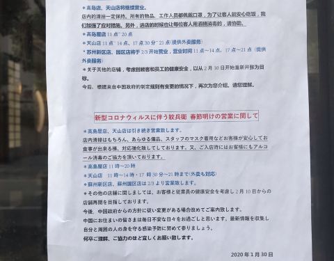 “纹兵卫”坐落在长宁区宋园路79号,是一家口味正宗的日料店,深受附近喜爱日料的居民和办公楼白领欢迎,因此开在这里已经有好多年了,生意一直不错。 只是最近这段时间情况特殊,实体餐饮店几乎没什么生意,都在经营外卖,或者干脆春节长假休到现在还闭门谢客。 中午,沿着宋园路从虹桥路口一直走到古羊路口,大约250米,开门的只有罗森超市和“纹兵卫”日料店两家。 “纹兵卫”门口贴了“纹兵卫”各处门店春节后营业情况的介绍,中文和日文,详细,认真,温和,为顾客考虑,很有日本这个民族的特点。