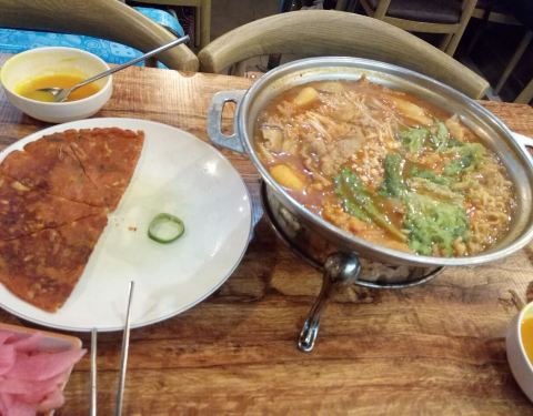 又去韩礼,点了不一样的食物。 这次去发现又换了新的菜单了,他说换一次菜单就涨一次价,也能理解毕竟物价飞涨的年代。 这次点了部队锅,只是发现拉面量好少的呀!芝士年糕才4只……好囧啊! 南瓜粥味道挺好的,还有酱萝卜好吃。