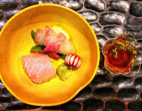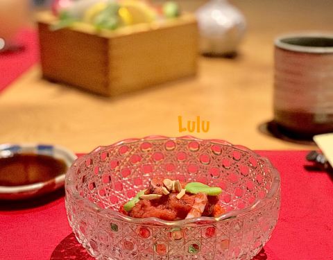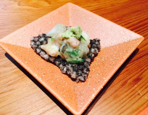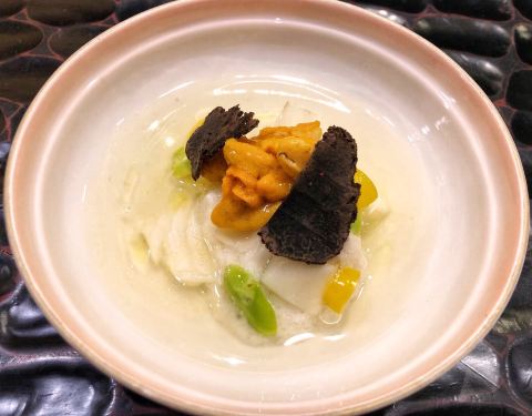 藏匿浦华大酒店内的日本料理 木质掩门 两间包厢 一个吧台 服务员身着制服 彬彬有礼 餐桌上折成衣的餐布、抹茶及热毛巾等...一看就很周到 台湾师傅主理~开启一场春日味蕾之旅 「草莓沙拉」草莓、甜玉米、坚果、鱿鱼、蚕豆佐以自制草莓酱 起到酸甜开胃的效果 「海胆榛果豆腐」紫苏叶垫底,墨鱼脆片在上,店家自制榛果豆腐与海胆为舞 佐以小撮芥末 层次丰富 曼妙体验 「日本富士山萤乌贼」蚕豆打制成泥铺底 萤乌贼幼小的身躯淋上了火龙果汁 个人觉得有一丢丢腥 「黑活鲷刺身」有来自爱媛县的活鲷刺身,更偏爱熊本县的黑鲔鱼大腹 粉嫩丰腴 脂肪在口腔慢慢融化 「黑松露海胆黑鳕鱼蒸物」洁白透亮的鲜嫩鳕鱼,融入黑松露&海胆&蚕豆 温和的 不喧宾夺主的 「脆皮蒲烧鳗鱼」酥脆的表层 低温慢烤保留其原汁原味 菠萝片是点睛之笔 提升了味觉 「手工芋泥虾卷」可以称为芋泥虾天妇罗~芋泥的细腻清甜搭配虾蓉的鲜嫩弹劲 很融合 「江户前握寿司四贯」选用日本越光米~分别制作了蜜柑鰤鱼、车虾、海胆军舰及鱼籽军舰 坐拥吧台的好处就是可以近距离欣赏师傅手法;另外搭配的味增汤也收到一众好评,头水紫菜的鲜美尽在这碗汤里 「京都风葛粉&草莓和风卷」有点类似河粉 透明质地 韧劲足~搭配红糖蘸酱一口满足;和风卷也出色的很,蛋糕柔软湿润 奶油细腻清甜 一颗草莓沁人心脾 感受了一场视觉、味觉的双重享受,在甜品中谢幕~