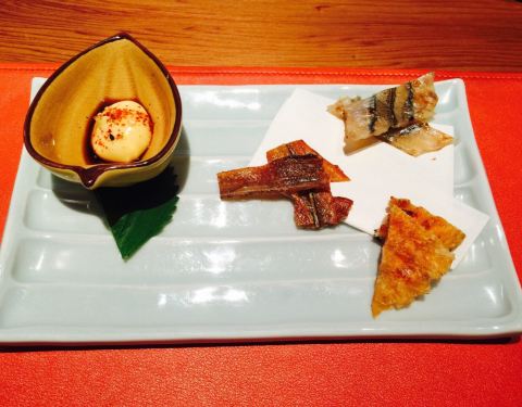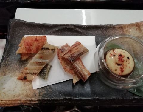 「鱼干三兄弟由针鱼」由安康鱼,鳗鱼3种鱼组合。肥美的鱼肉经过风干和烤制后,鱼肉中的油脂被完全挥发出来,咀嚼中感受鲜甜的鱼干味和鱼干独有的醇香。 「海胆榛果豆腐」墨鱼脆片垫于榛果豆腐之下。顶部是选北海...