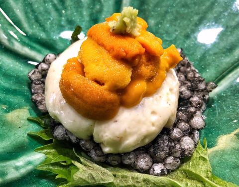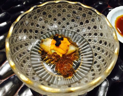 - 绝对物超所值[强] 前菜 鱼子酱海胆鲍鱼,多道工序,蟹醋冻铺底,鲍鱼随后,海胆置于鲍鱼之上,最...