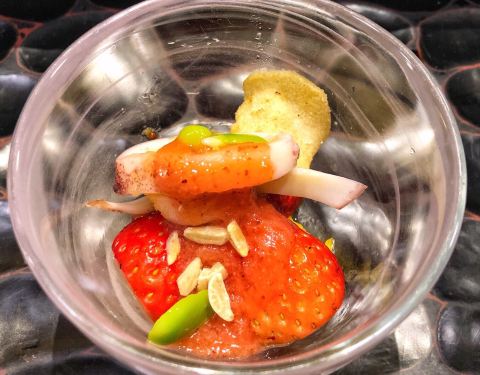 藏匿浦华大酒店内的日本料理 木质掩门 两间包厢 一个吧台 服务员身着制服 彬彬有礼 餐桌上折成衣的餐布、抹茶及热毛巾等...一看就很周到 台湾师傅主理~开启一场春日味蕾之旅 「草莓沙拉」草莓、甜玉米、坚果...