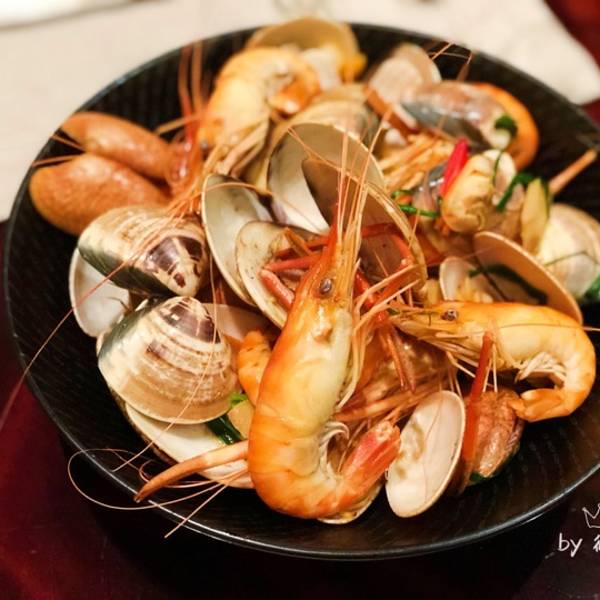 姜炒海鲜 海鲜可以根据自己喜好现捞,再由厨师烹调。姜炒海鲜、麻辣炒海鲜两种都试了一下,两种都是好选择。大虾、蛤蜊都特别新鲜,简单的姜炒就足够美味。