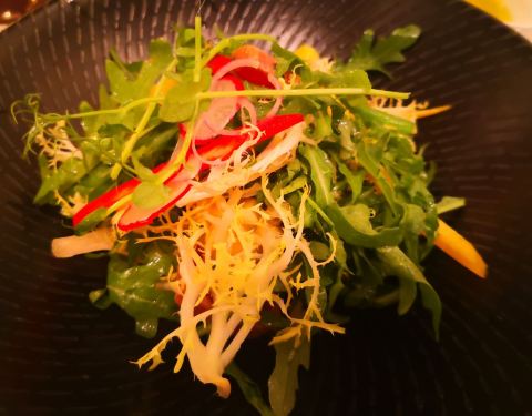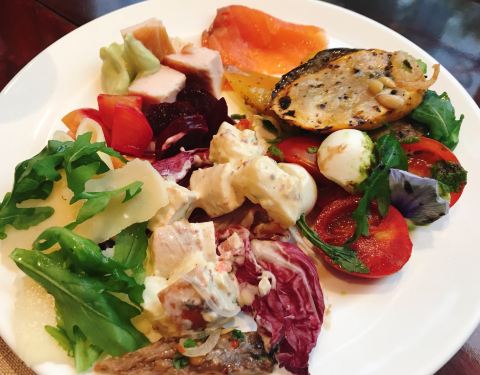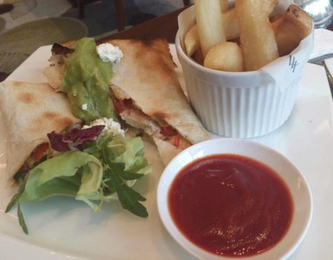 餐前面包 好几个不同的品种 口感也不太一样 他们家的黄油很嗲呢 全部抹面包吃掉啦 橙味三文鱼 所谓的橙味 也许就是旁边的三滴橙汁吧 三文鱼完全没有味道的 被吃惯蘸芥末的朋友疯狂吐槽 烧烤猪肋排 三大根猪肋排 量着实有点大呢!猪肋很嫩的 调味有点微微的甜 是77喜欢的味道 另外配了烤土豆和生菜色拉 这样一份下去 瞬间饱了呐 卡真鸡肉卷 只有一位朋友选了这款的 饼感觉比较一般吧 里面的鸡肉还不错