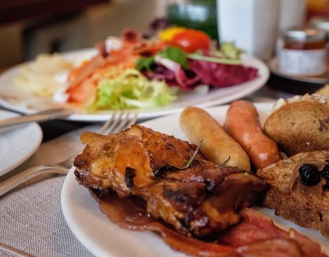 - 早餐肠很好吃,肉量满满。点了培根班尼迪克蛋,好吃到精艳。早餐品种不算最多,但基本款都有