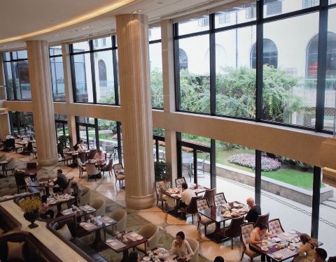 酒店早餐在这里进行,早上六点到十点开放,下楼的时候餐厅人还挺多的,窗景很棒,可惜坐满了人,食物品类以西餐和中餐为主,吃中餐蒸饺的时候吃出了一个坚硬的塑料,幸亏下嘴不狠没有出现可怕后果,不过想想还是很后怕的,这样的地方不应该出现视频隐患问题吧…… 店名:百味园 地址:上海外滩华尔道夫酒店地下一层
