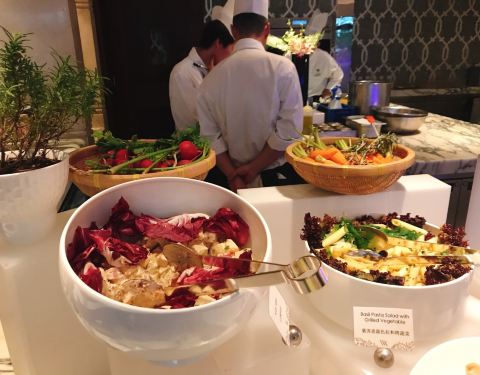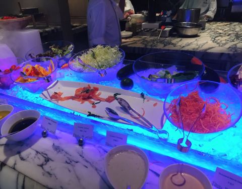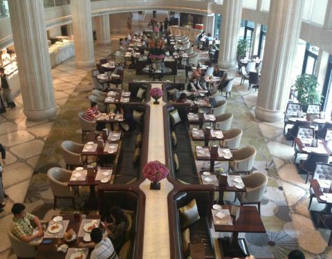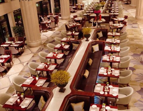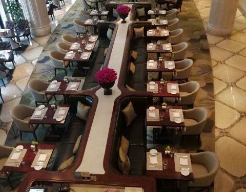 开在华尔道夫酒店里面的饭店,当然很高大上,不过是自助餐所以也贵不到哪儿去,平时午餐团购价才二百多一位,晚餐三百多,标准价格也就488吧加服务费吧