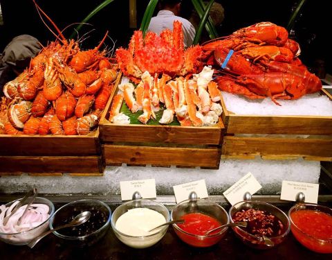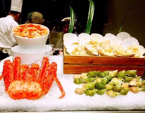 餐厅是半开放式的,喜欢落地窗的区域。 喜欢帝王蟹、小青龙,小青龙比波士顿龙虾的肉质更为细腻更有弹性。基围虾弹性十足。有特色的日式小食和刺身,喜欢三文鱼。中式的热菜也不少,蒸点有三样,烧腊、面档、烫菜...餐厅是半开放式的,喜欢落地窗的区域。 喜欢帝王蟹、小青龙,小青龙比波士顿龙虾的肉质更为细腻更有弹性。基围虾弹性十足。有特色的日式小食和刺身,喜欢三文鱼。中式的热菜也不少,蒸点有三样,烧腊、面档、烫菜亦有。羊排好吃,鳕鱼也不错。甜品都有榛子蛋糕、水果塔、芒果慕斯、酸奶慕斯、巧克力慕斯杯,冰淇淋区的巧克力蛋糕。 服务很好,虽然人多时有点小忙,但是有求必应是肯定的。