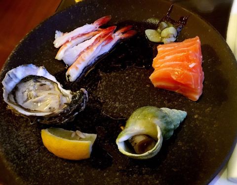 刺身当然是重头戏之一,三文鱼、雪蟹脚、海螺、扇贝、甜虾等等滚一圈,算是第一轮。