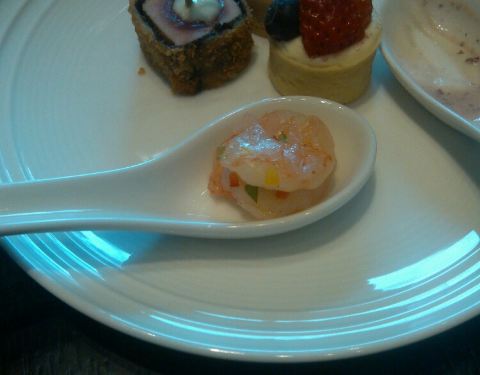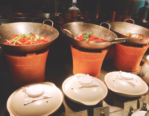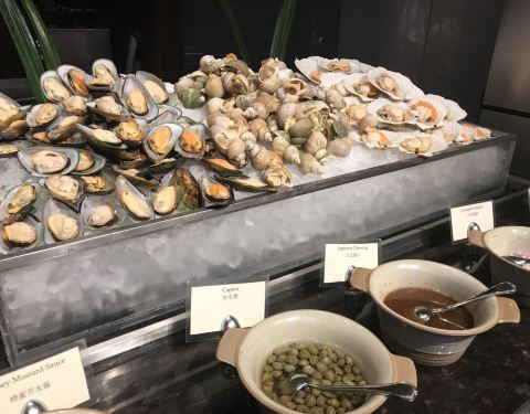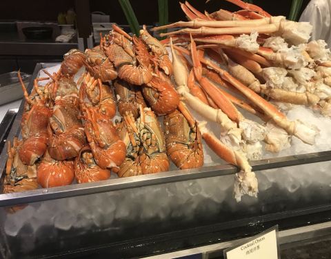 餐厅是半开放式的,喜欢落地窗的区域。 喜欢帝王蟹、小青龙,小青龙比波士顿龙虾的肉质更为细腻更有弹性。基围虾弹性十足。有特色的日式小食和刺身,喜欢三文鱼。中式的热菜也不少,蒸点有三样,烧腊、面档、烫菜亦有。羊排好吃,鳕鱼也不错。甜品都有榛子蛋糕、水果塔、芒果慕斯、酸奶慕斯、巧克力慕斯杯,冰淇淋区的巧克力蛋糕。 服务很好,虽然人多时有点小忙,但是有求必应是肯定的。