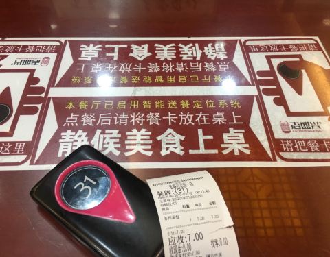 前台点餐付费后,会给一个智能定位系统,找到空位把它放在桌子上,服务员会自动把美食送上桌