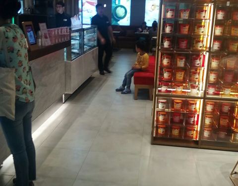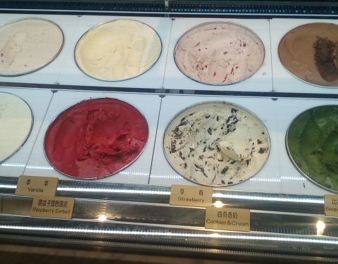 吃完晚饭去吃点甜品,因为还是在饭点,所以没啥人。点了几个品种的球,还是巧克力味的最好吃,一个加了夏威夷果果的不好吃,果粒太大,感觉和冰激凌难以融合在一起,下次不点这个口味了。